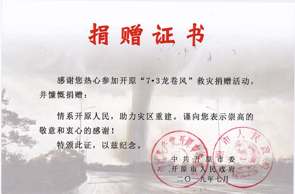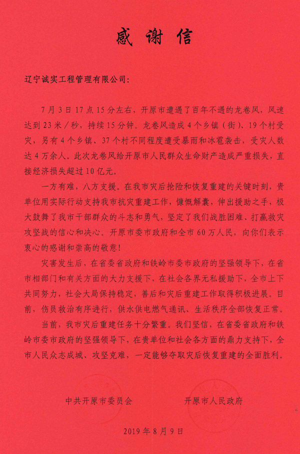 2019年7月3日一場可怕的龍卷風席卷了遼寧省開原市,據(jù)初步統(tǒng)計,這場災害共造成6人死亡、190余人受傷、2.8萬人受災,房屋受損6451戶,農(nóng)業(yè)大棚受損25棟,農(nóng)田受災14.6萬畝,100余萬平方米廠房遭受嚴重損壞,造成直接經(jīng)濟損失約10.75萬元。災情發(fā)生后,省委、省政府及省住建廳領(lǐng)導高度重視,號召全省監(jiān)理企業(yè)為此次災情捐款。龍卷風無情,人有情。為了幫助受災同胞共渡難關(guān),我單位積極響應省委、省政府、省建設廳以及省協(xié)會的號召,在第一時間捐款3000元。參與此次捐款的省監(jiān)理單位共計近30家,捐款數(shù)額從500元至20000元不等。事后,開原市委、開原市政府為我單位頒發(fā)了感謝信以及捐贈證書。