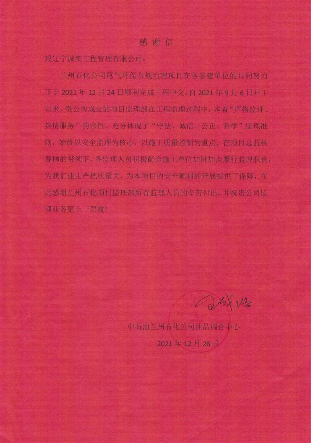 12月28日,蘭州項(xiàng)目監(jiān)理部收到中石油蘭州石化公司油品調(diào)合中心發(fā)來(lái)的感謝信。信中,業(yè)主單位對(duì)項(xiàng)目部全體監(jiān)理人員在項(xiàng)目開(kāi)展過(guò)程中的工作表現(xiàn)給予了充分的肯定和高度的贊譽(yù)。這是對(duì)我公司卓越的項(xiàng)目管理水平和強(qiáng)大的人才隊(duì)伍的最好見(jiàn)證,同時(shí)也完美的展現(xiàn)了我們一貫以來(lái)“敢打硬仗、善打難仗、能打勝仗”的優(yōu)良傳統(tǒng)和作風(fēng)。希望各項(xiàng)目部要以此為動(dòng)力,不忘初心,牢記使命,擔(dān)當(dāng)作為,為樹(shù)立誠(chéng)實(shí)品牌、打造誠(chéng)實(shí)形象再立新功!
