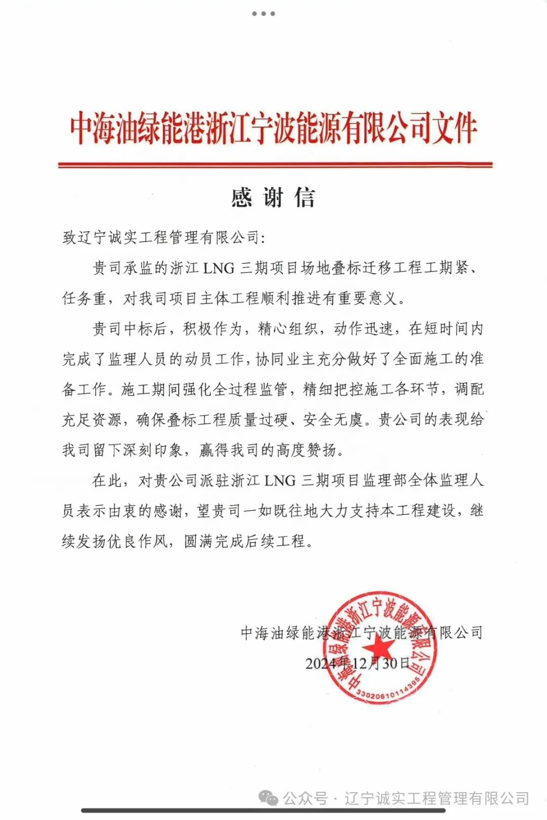 至此2025元旦來(lái)臨之際,浙江LNG三期項(xiàng)目場(chǎng)地疊標(biāo)遷移項(xiàng)目部收獲來(lái)自于中海油綠能港浙江寧波能源有限公司發(fā)來(lái)的一封感謝信。